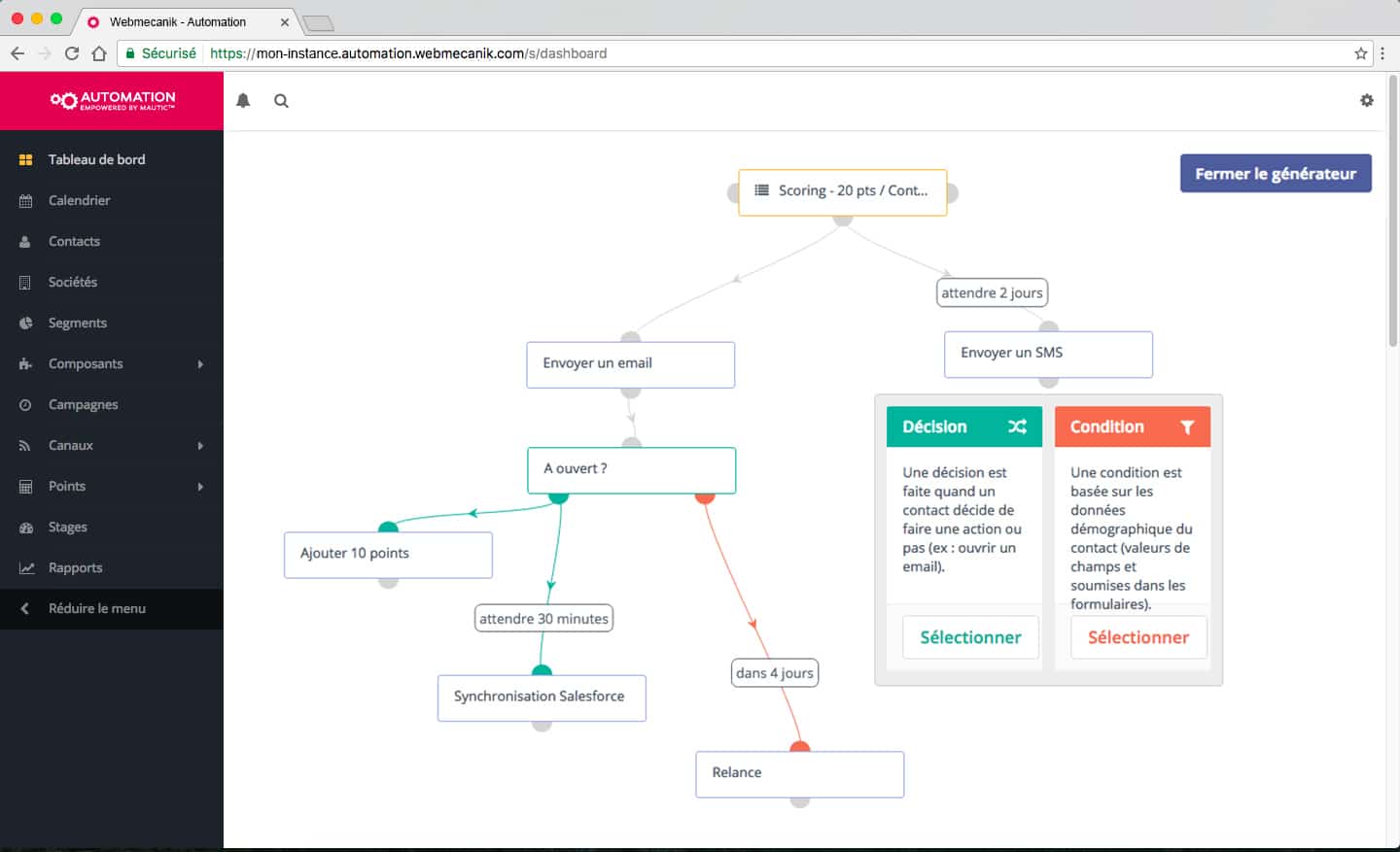 E’ la soluzione di marketing automation tutto incluso.Webmecanik Automation è la prima soluzione europea costruita sulla piattaforma open source Mautic. Ti offre tutti gli strumenti necessari per migliorare la conversione dei lead, alimentare e automatizzare la relazione con loro e garantire un ROI migliore su diversi canali di comunicazione (email, SMS, notifiche, social, ecc.). . Abbiamo accumulato una grande esperienza che ti offriamo attraverso una soluzione SaaS gestita e soluzioni di accompagnamento e formazione per rendere le tue campagne di marketing un successo per la tua azienda.